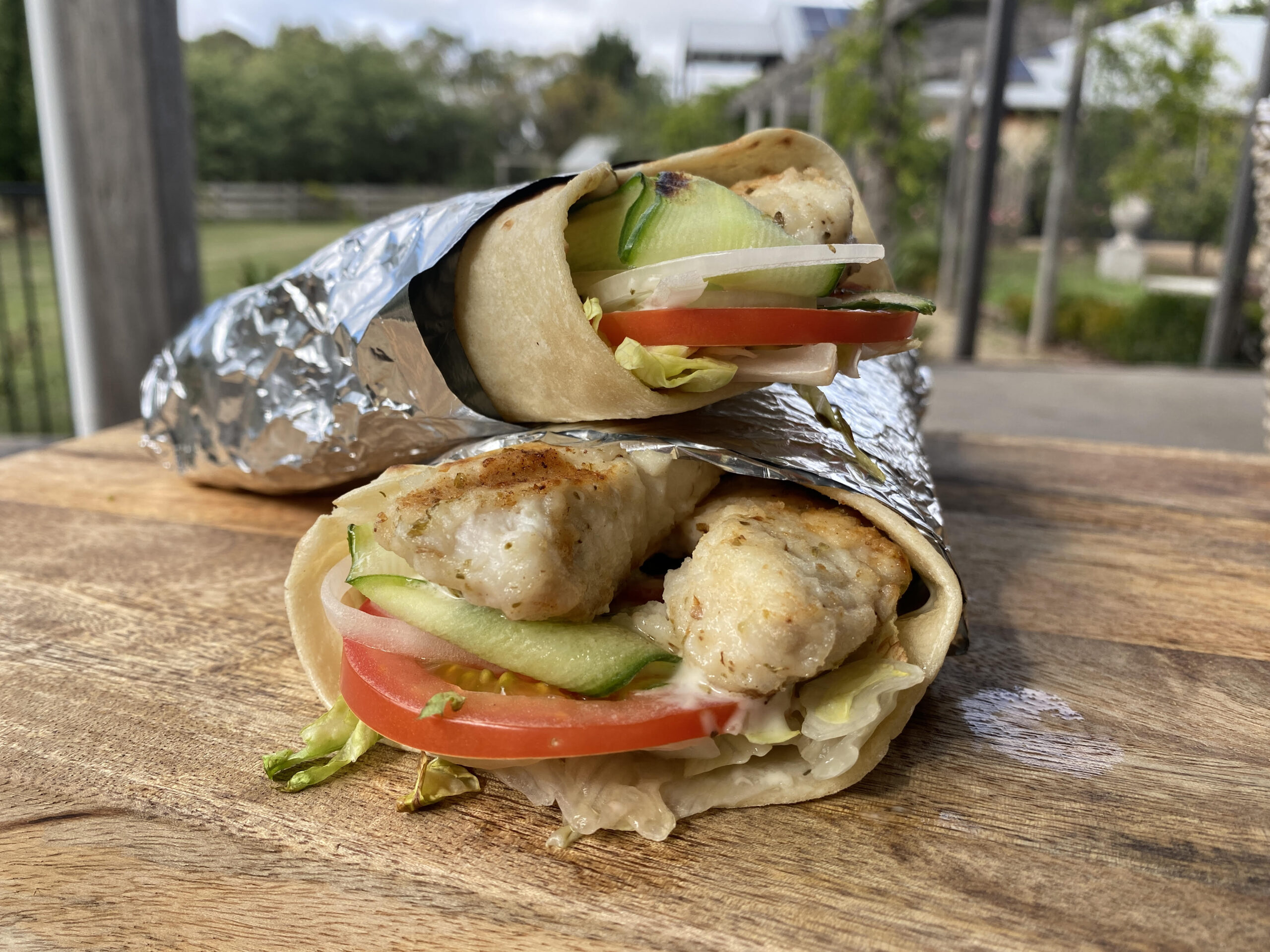 - To build the wraps, start with a drizzle of tartare down the centre and then layer with the lettuce, tomato, flake and cucumber. Fold the bottom of the pita over the ingredients to seal the end and roll into a wrap.