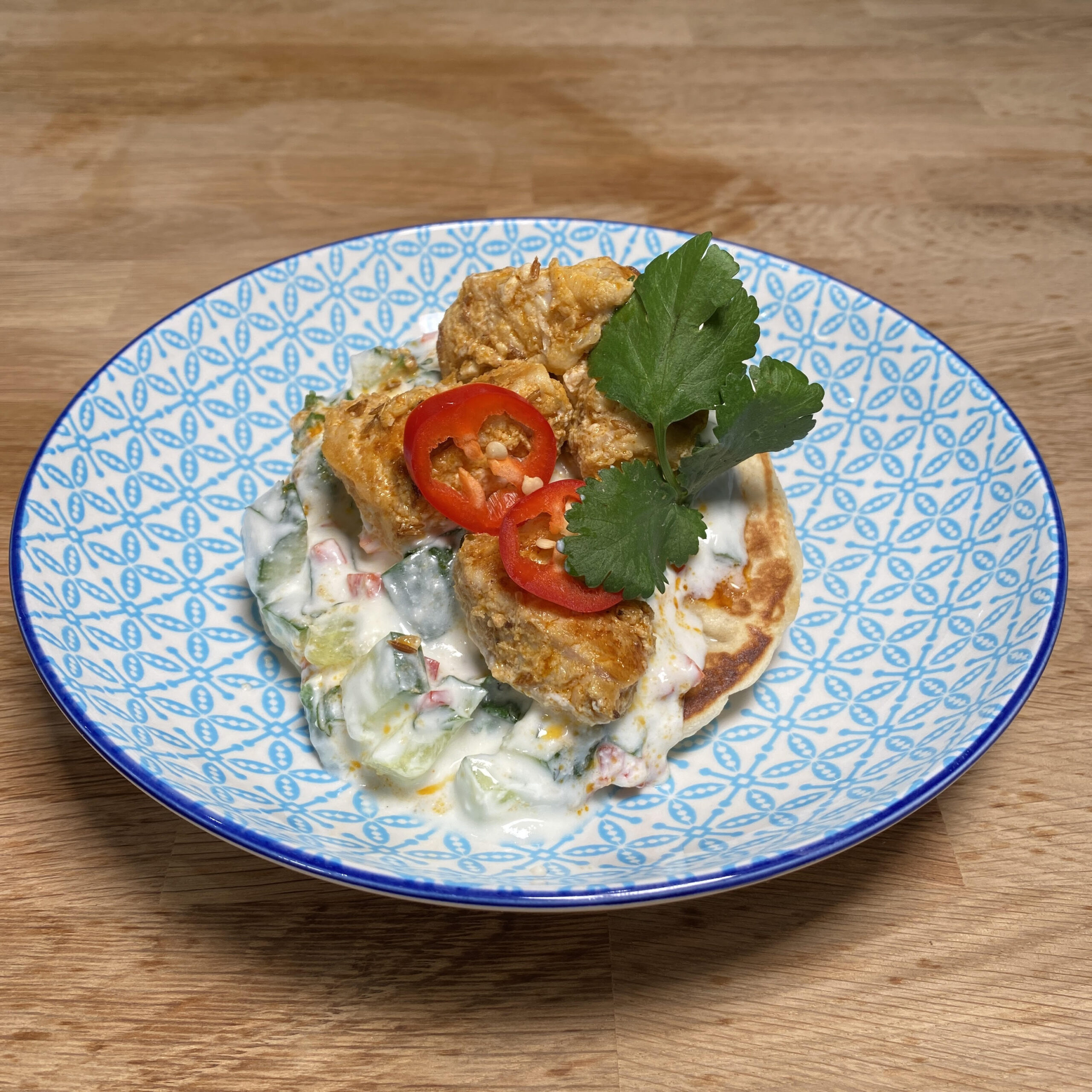 6. To present your dish, add a couple of generous spoons of the yoghurt sauce to the naan bread and place the fish on top. Garnish with a little coriander and serve whilst hot!